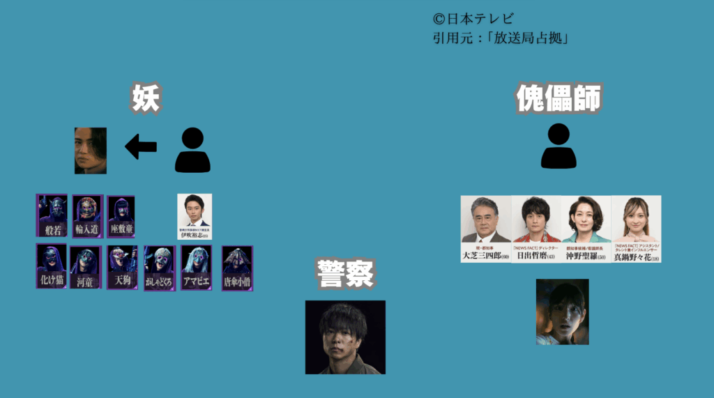 - 傀儡士サイド:大芝、日出(メディア担当)、沖野(都知事候補)、真鍋(インフルエンサー)、のっぺらぼう(死体処理役)